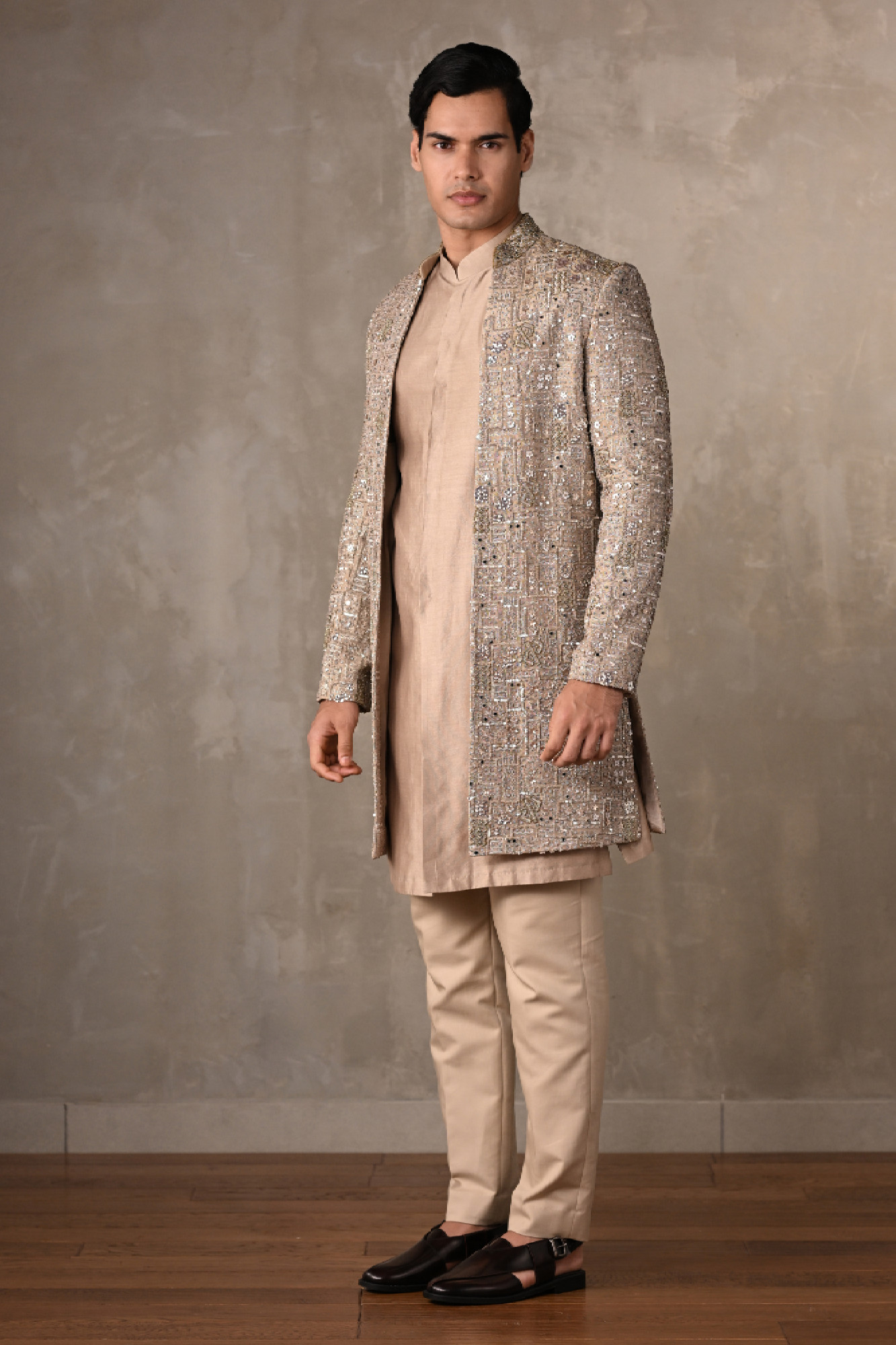 This beige chanderi open jacket sherwani set, crafted for the modern groom and festive connoisseur. The sherwani jacket, designed in a longline open-front silhouette, is richly adorned with all-over sequin and bead embellishments, creating a dazzling yet sophisticated texture. It is paired with a plain beige kurta.
