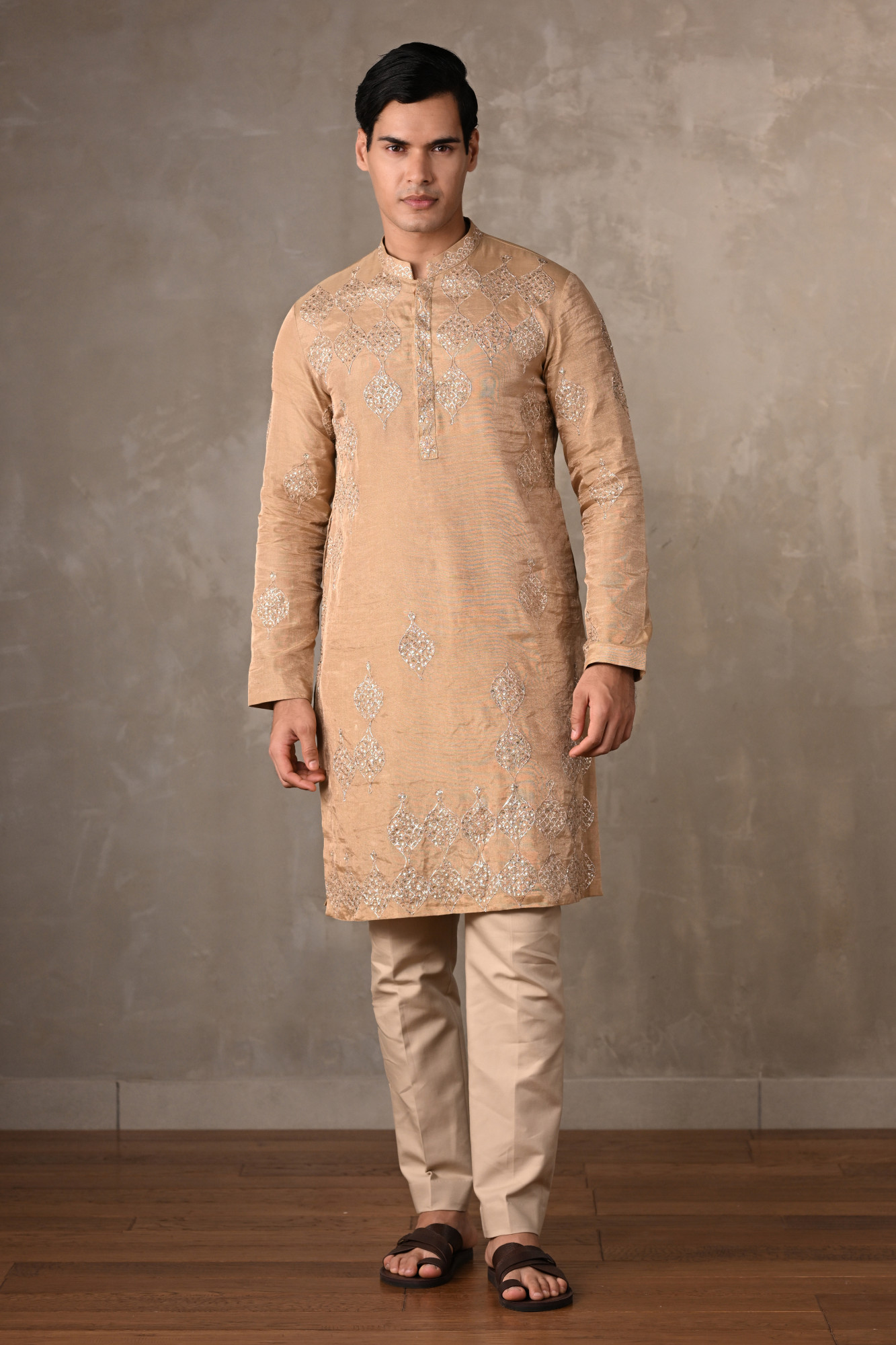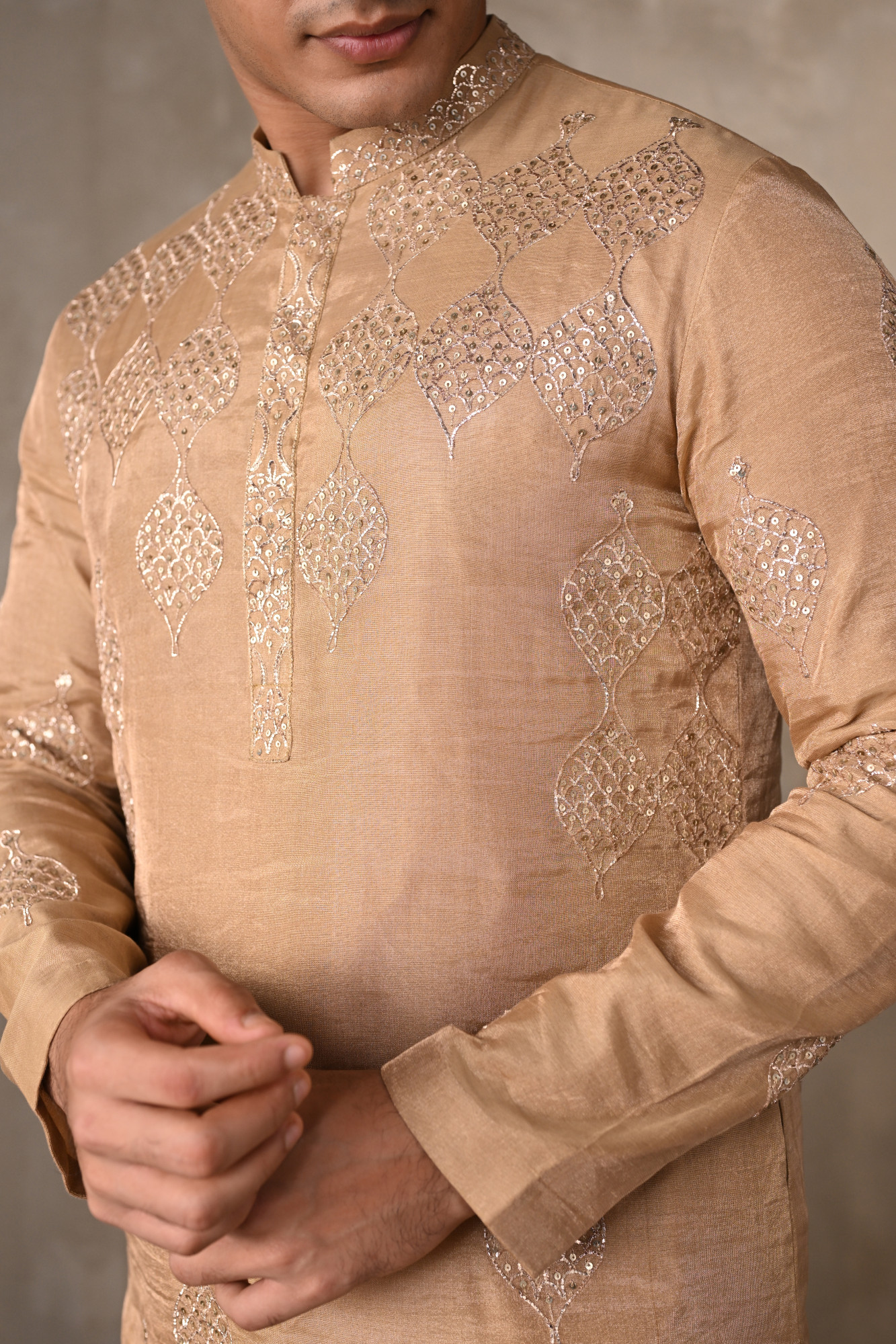 Crafted from lightweight tissue fabric, it carries a subtle shimmer that enhances its regal appeal. the kurta is adorned with delicate all-over embroidery in refined motifs, with detailed work along the neckline, cuffs, and hemline.