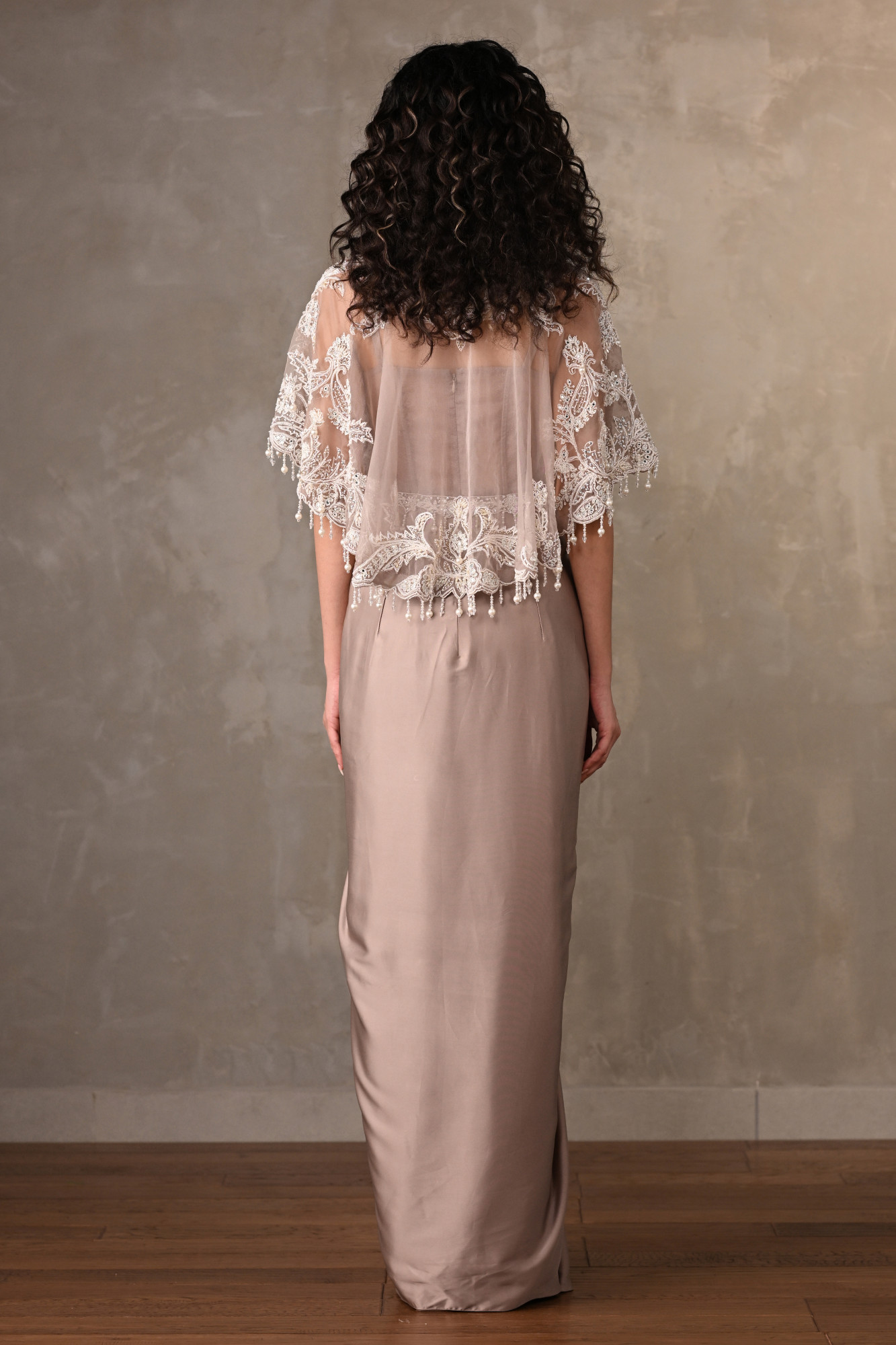 Crafted from fluid satin that drapes effortlessly, this gown features a structured corset-style bodice that beautifully contours the silhouette, enhancing its feminine allure. a delicately embroidered short cape with intricate lacework and tassel details lends an ethereal charm.