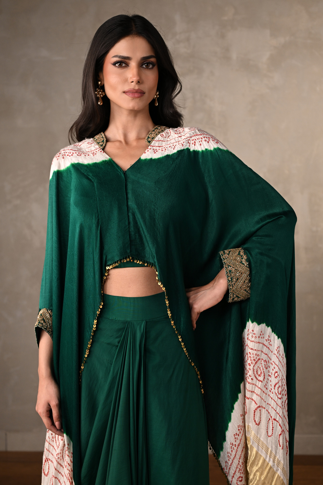 Crafted in luxurious silk, the outfit features a minimal bustier paired with a fluid draped skirt that flows with effortless grace. the highlight is the statement cape, detailed with intricate cheed, dabka, sequin, and cutdana embroidery.