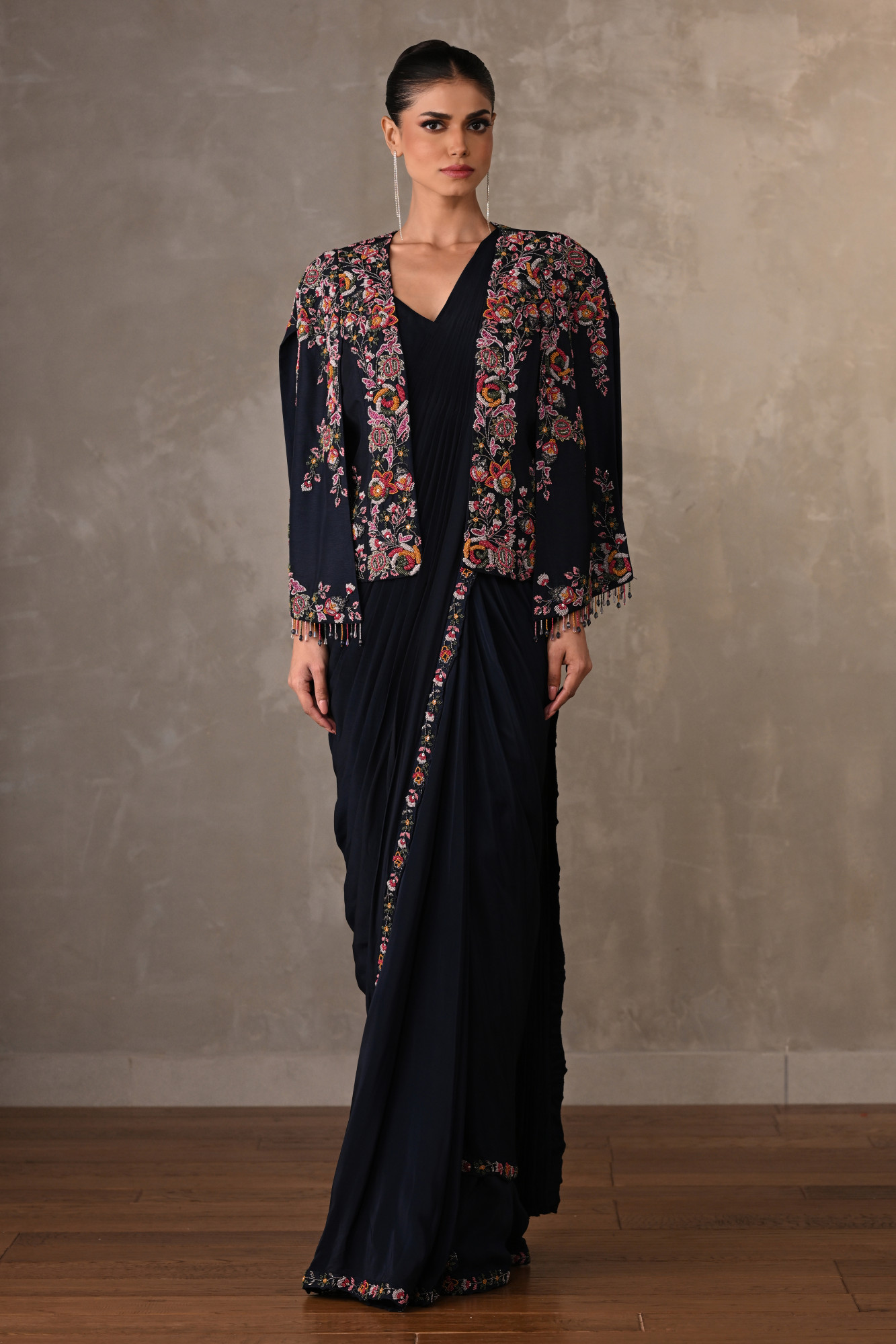 This navy drape saree set is crafted in luxurious heavy crepe fabric, featuring a delicately embroidered border, with multicolour cheed, sequins, and cutdana work. the ensemble is elevated with a statement short embroidered jacket, richly adorned with vibrant floral detailing and subtle beaded fringes.