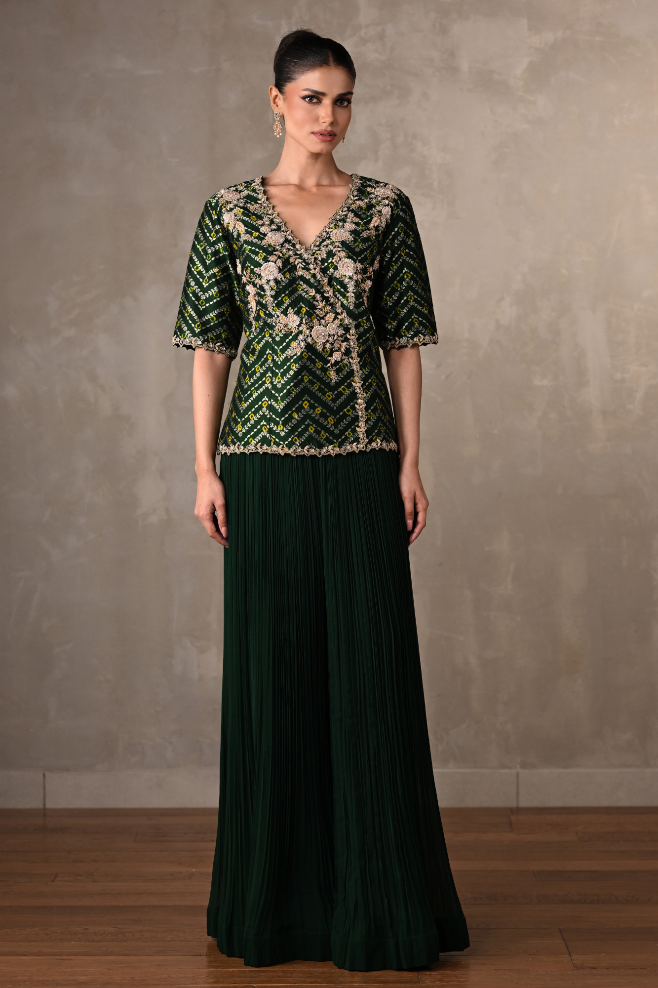 The outfit features a structured v-neck top adorned with intricate dabka and zari embroidery, creating a refined play of texture and shimmer. the floral accents merge seamlessly with geometric patterns, making the embroidery both traditional and contemporary. paired with finely pleated wide-leg bottoms, the flowing silhouette enhances movement while offering effortless grace.