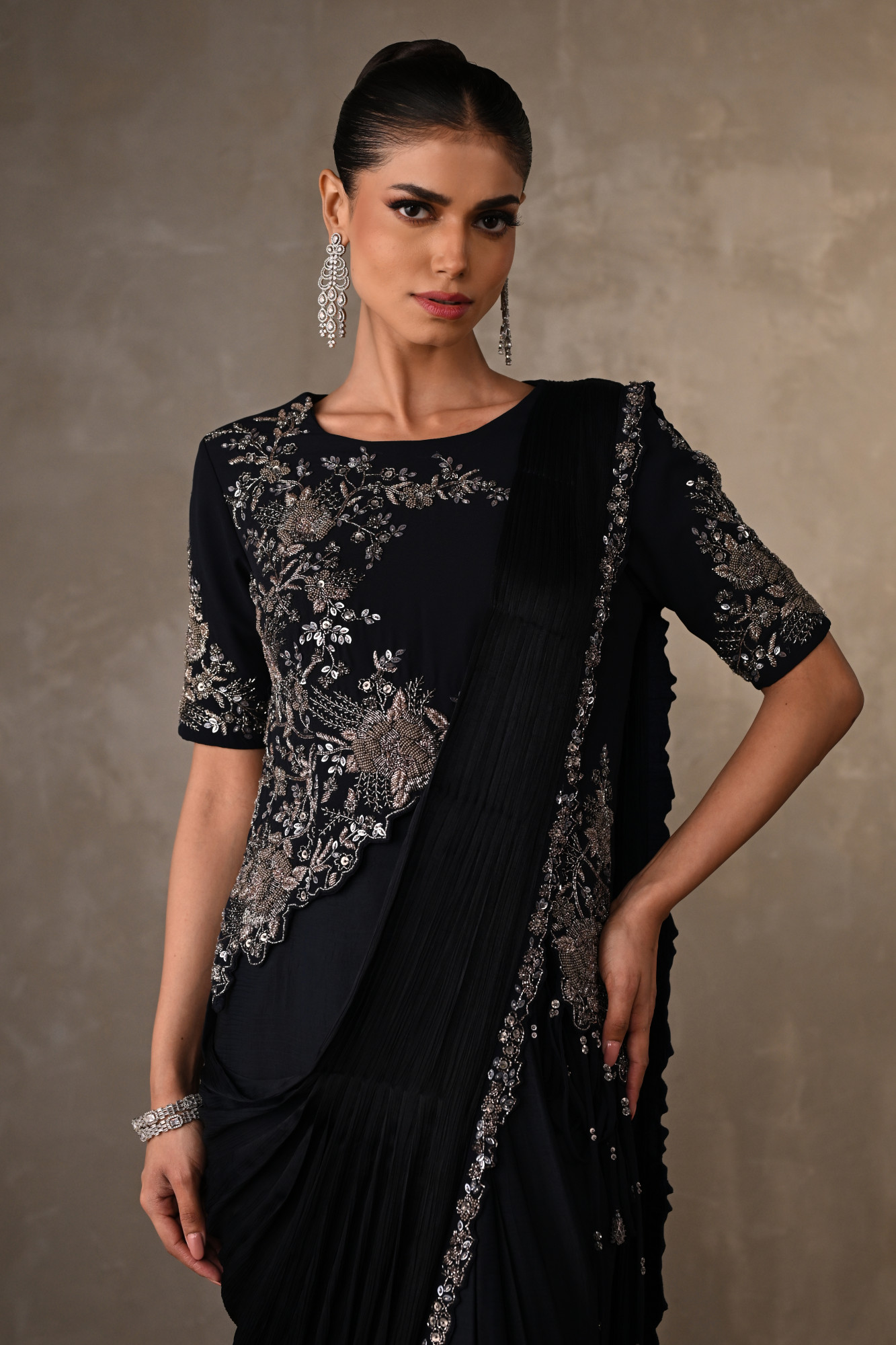 This blue drape saree set is crafted in fluid satin chiffon. the ensemble is adorned with intricate cheed, sequins, and cutdana embroidery, forming delicate floral patterns. paired with a meticulously embellished blouse featuring all-over embroidery and scalloped detailing at the hem.