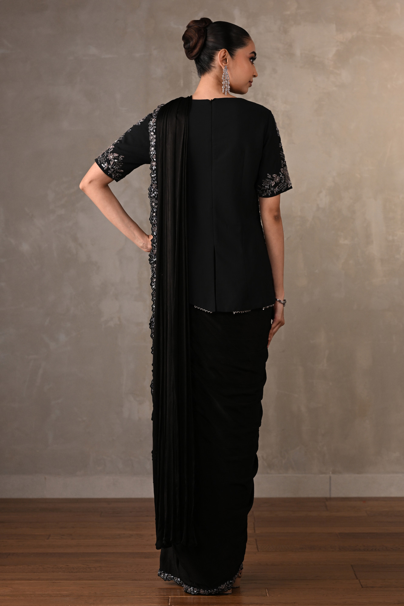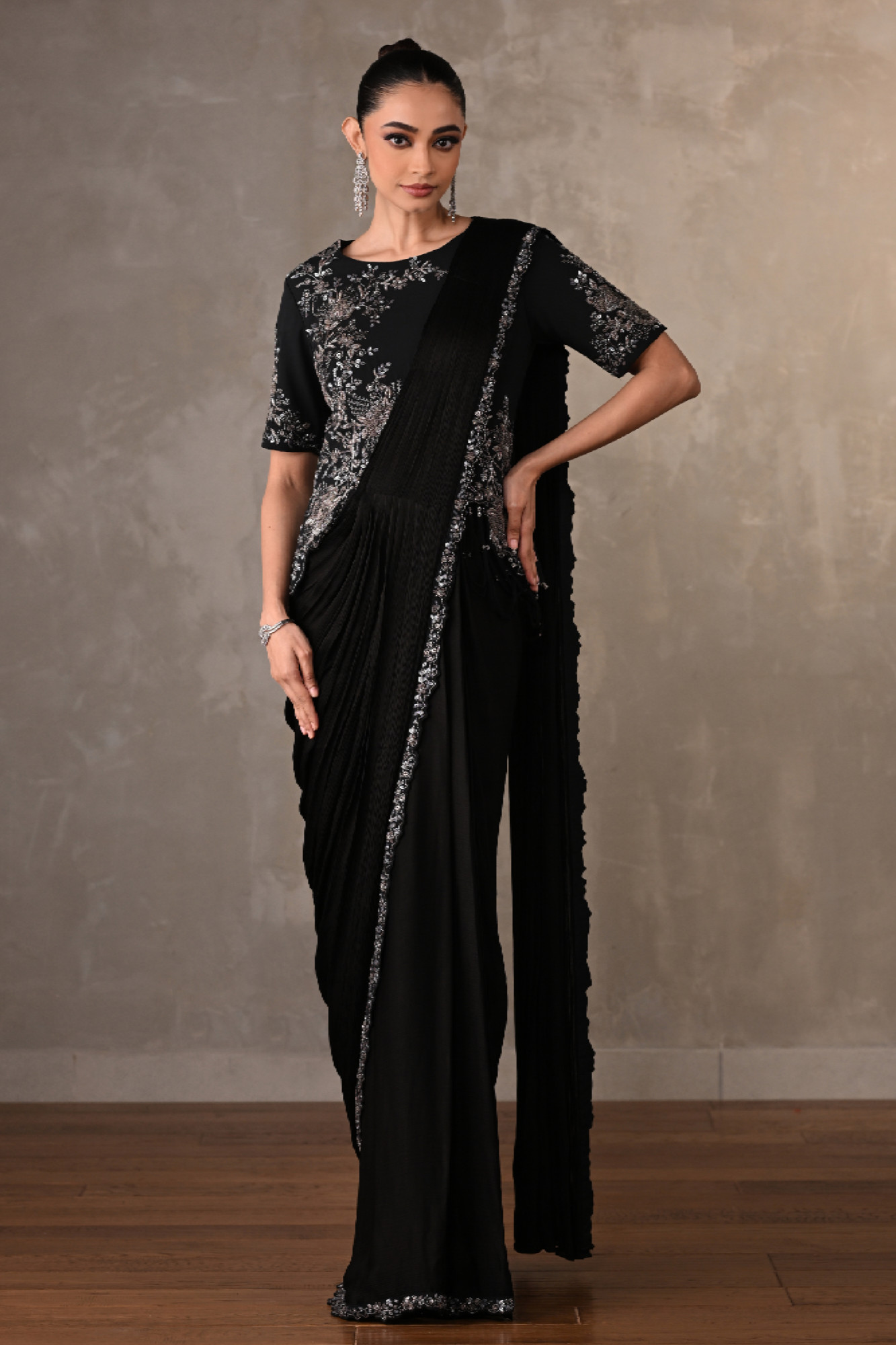 This black drape saree set is crafted in fluid satin chiffon. the ensemble is adorned with intricate cheed, sequins, and cutdana embroidery, forming delicate floral patterns. paired with a meticulously embellished blouse featuring all-over embroidery and scalloped detailing at the hem.