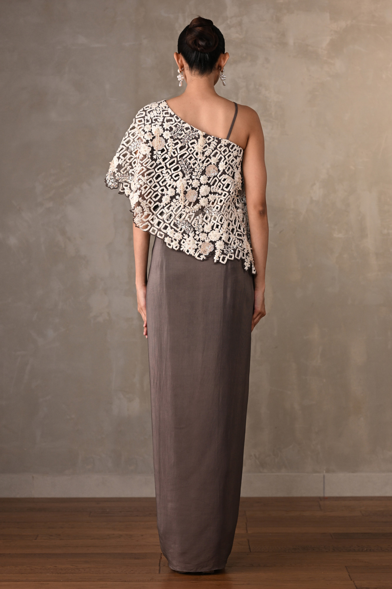 This ensemble features a beautifully handcrafted asymmetrical lace cape top with intricate cutwork and floral embroidery, detailed with thread work with sequins, cutdana and pearl work, layered over a muted crepe draped skirt. The fluid silhouette flatters the frame while the delicate craftsmanship on the top adds a couture finish.