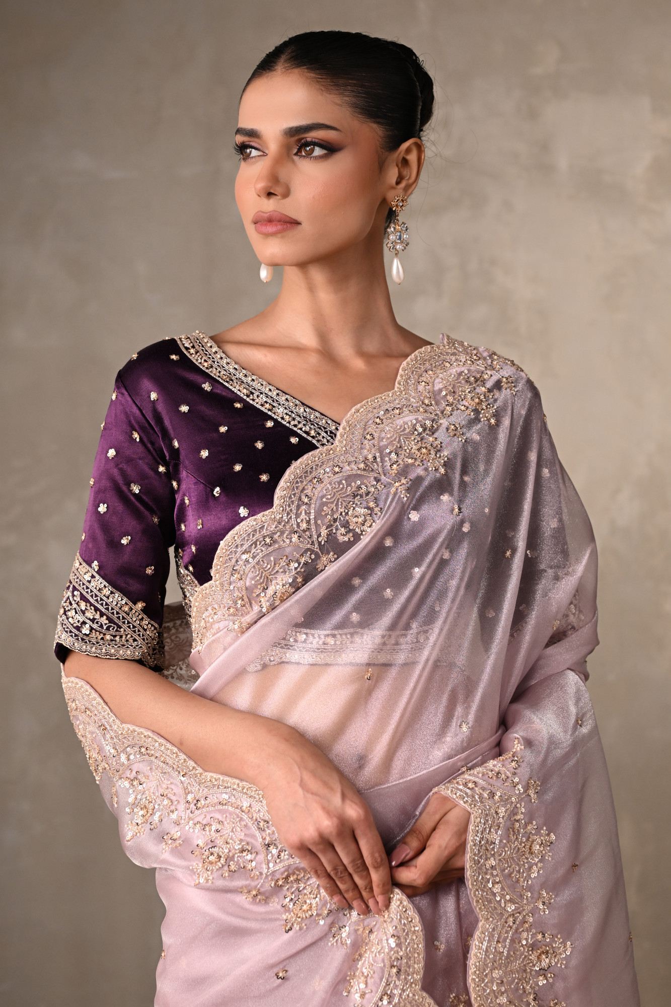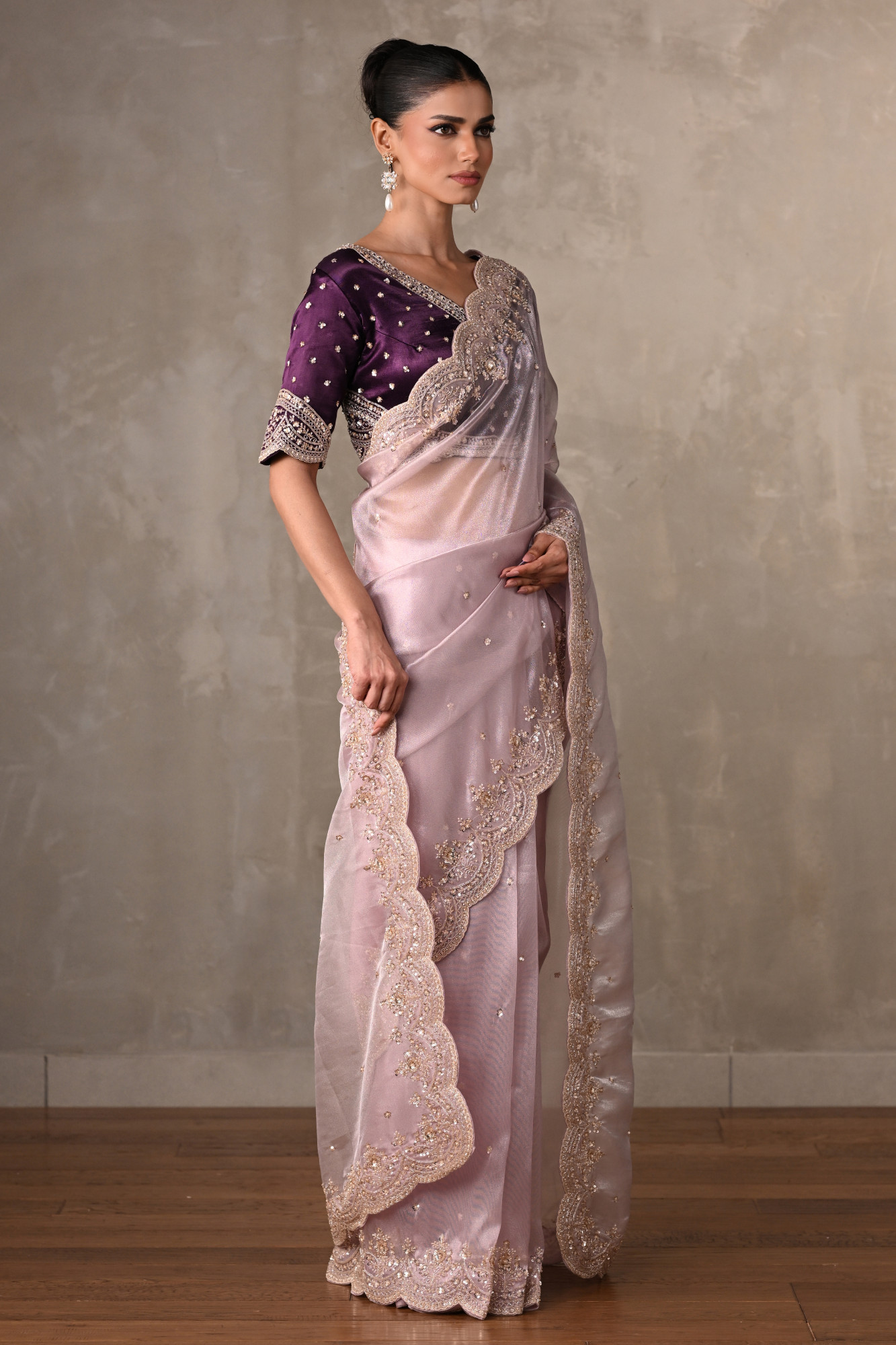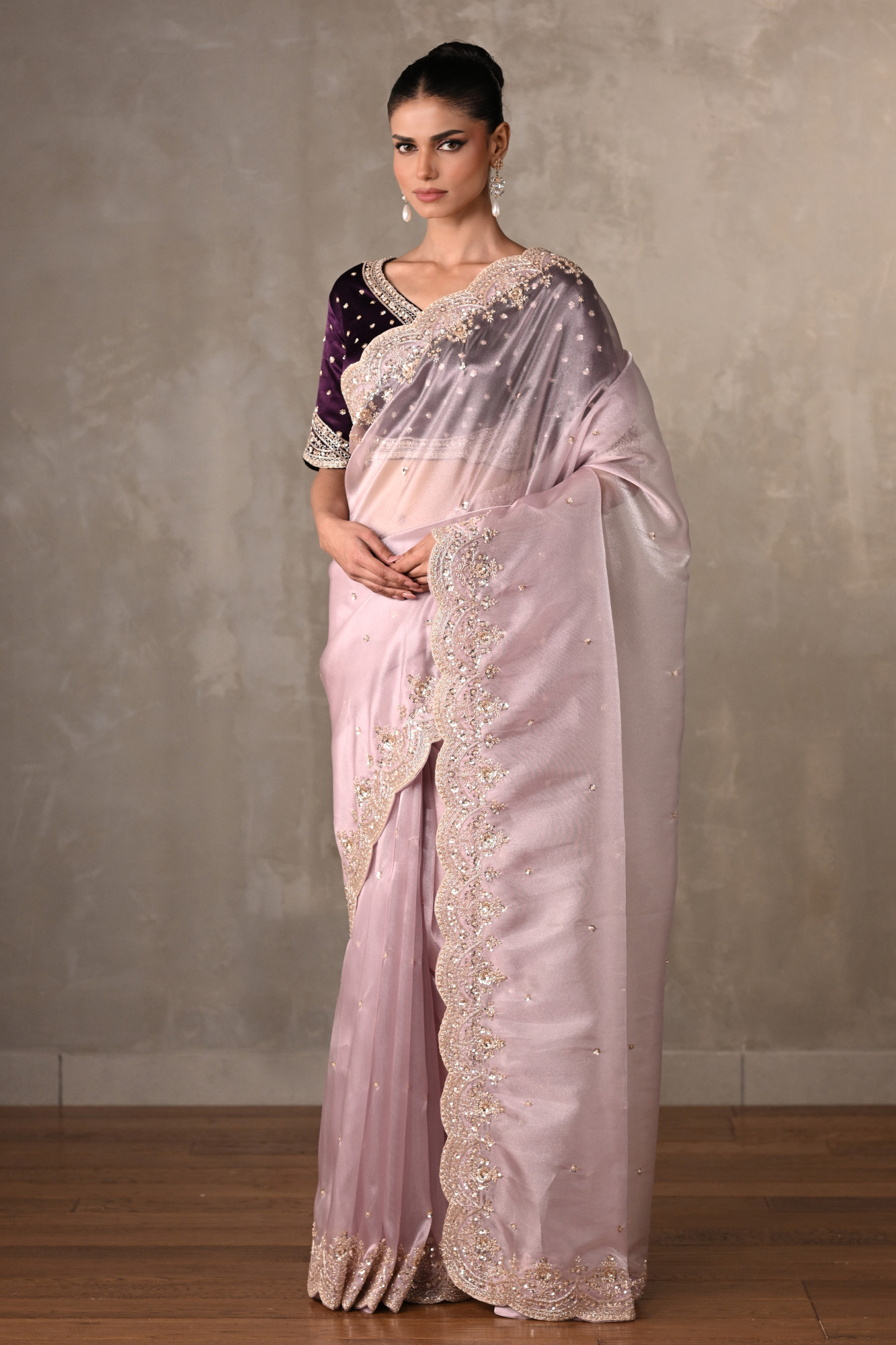 Crafted from lightweight organza fabric, the saree is intricately adorned with cutdana, tikki, and moti work, lending a soft shimmer and exquisite detailing across its surface. paired with a richly embroidered blouse that beautifully contrasts the saree’s delicate hue.