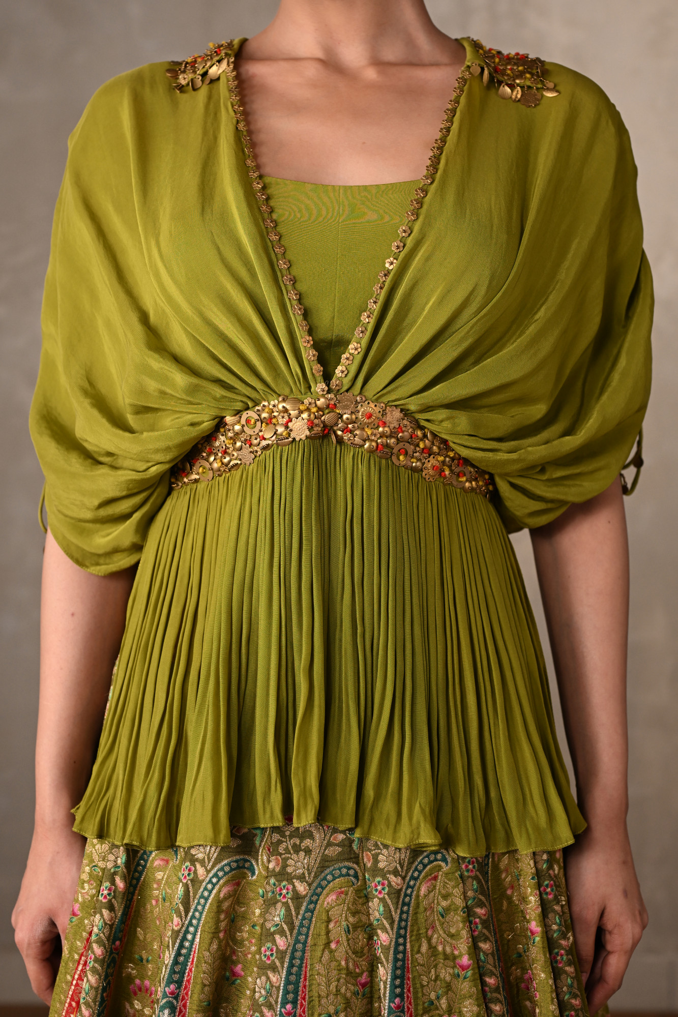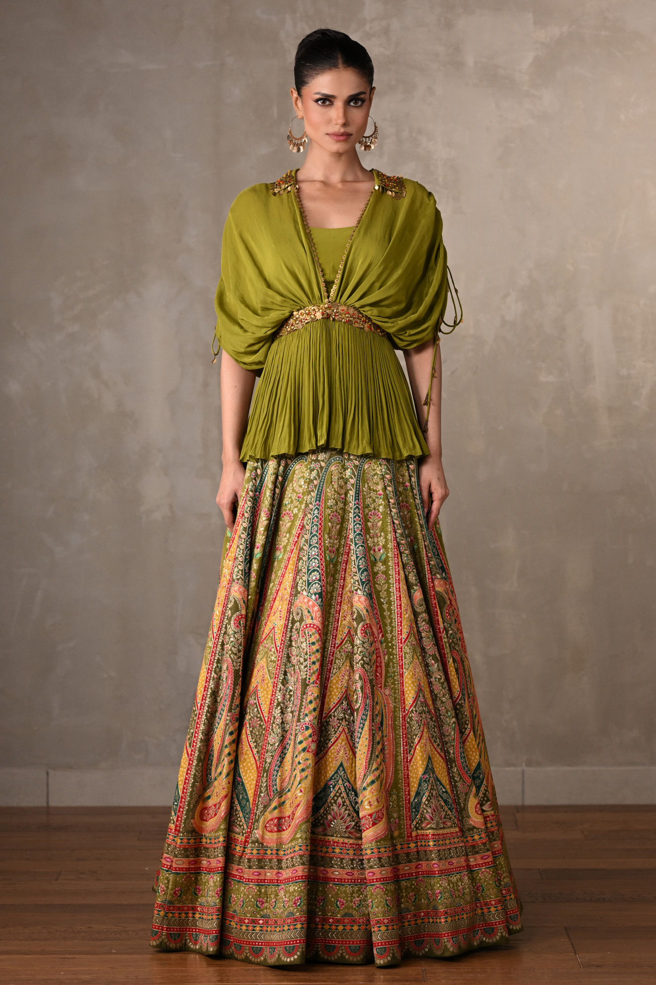 Crafted from luxurious silk fabric, the flowing lehenga features a vibrant multicolour paisley and floral pattern, intricately embellished with fine sequins and cheed work. the statement top in a deep mehendi green hue adds a contemporary twist with its pleated, draped design and cinched waistline, finished with elegant embellishments along the neckline and waist. soft gathers and sleeve tie detailing enhance the fusion appeal.