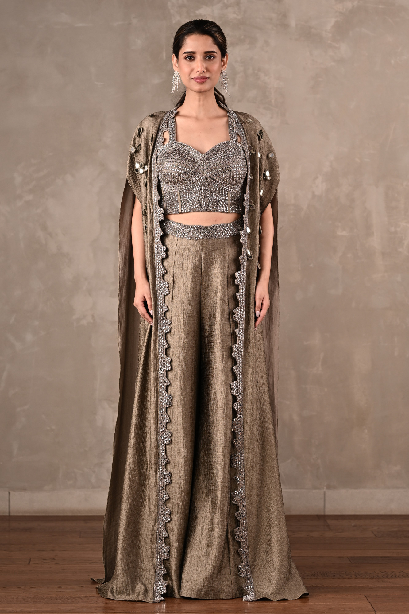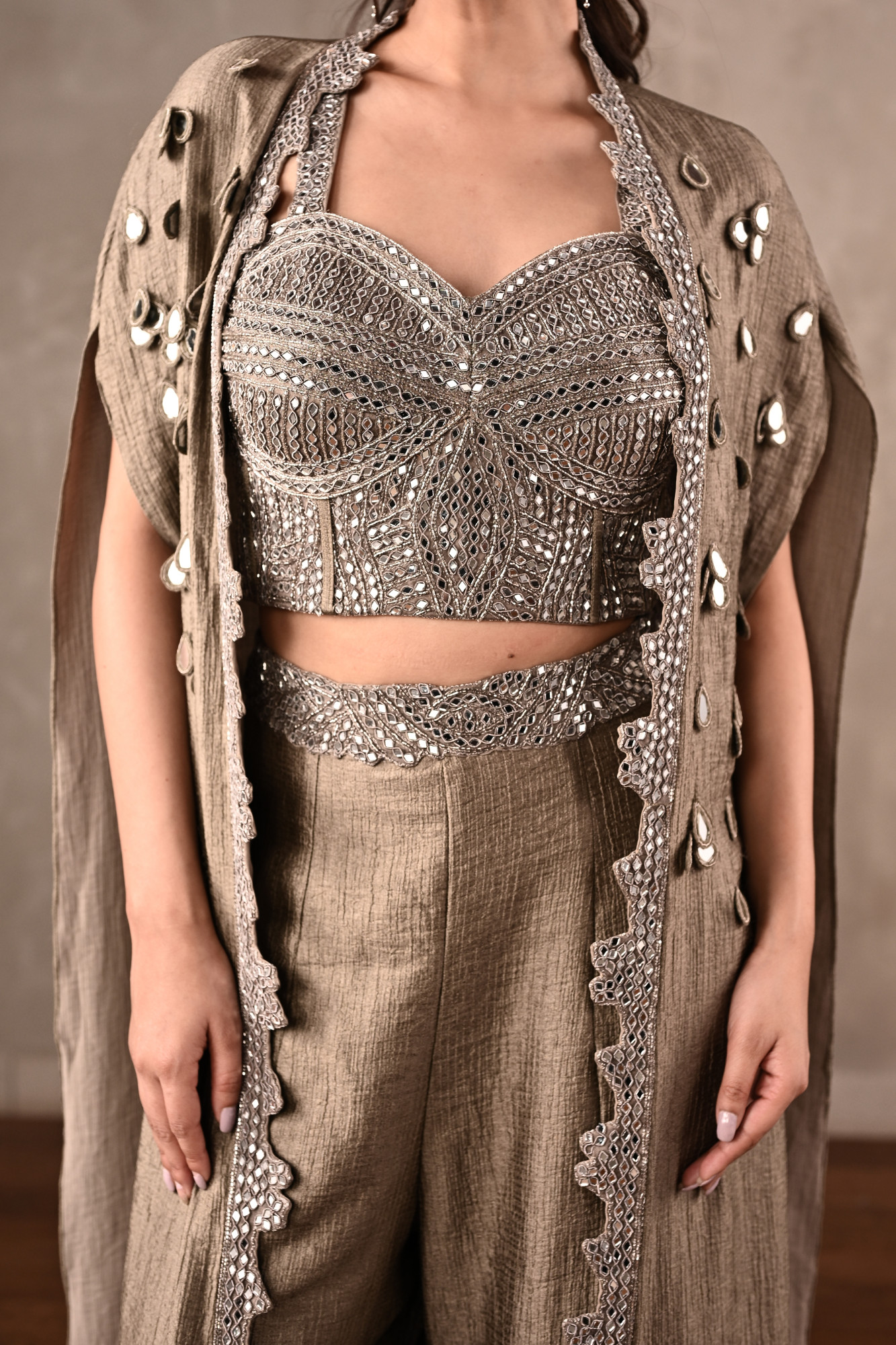 The three-piece ensemble that blends contemporary structure with intricate craftsmanship. The sculpted bustier is richly adorned with mirror, cutdana, and dabka embroidery, creating a luminous, textured surface with refined detailing. It is paired with fluid crushed-fabric pants and a dramatic cape featuring delicate embellishment accents and ornate borders.