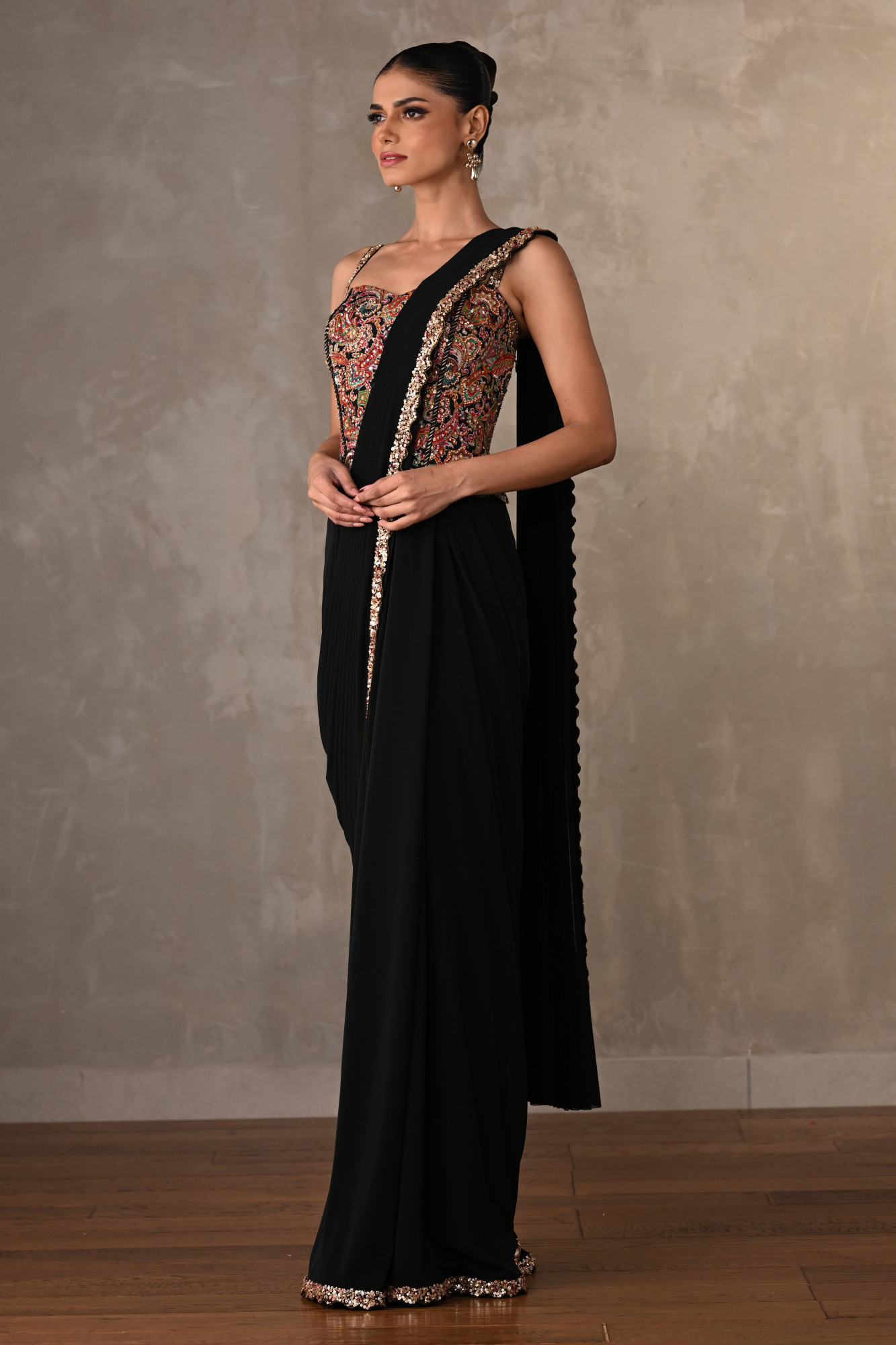 This black lycra drape gown features a sculpted silhouette paired with a vibrant, embroidered multicolor printed bodice. the structured pleats and embroidered border add elegance, while the corset-style top brings a touch of bold glamour.