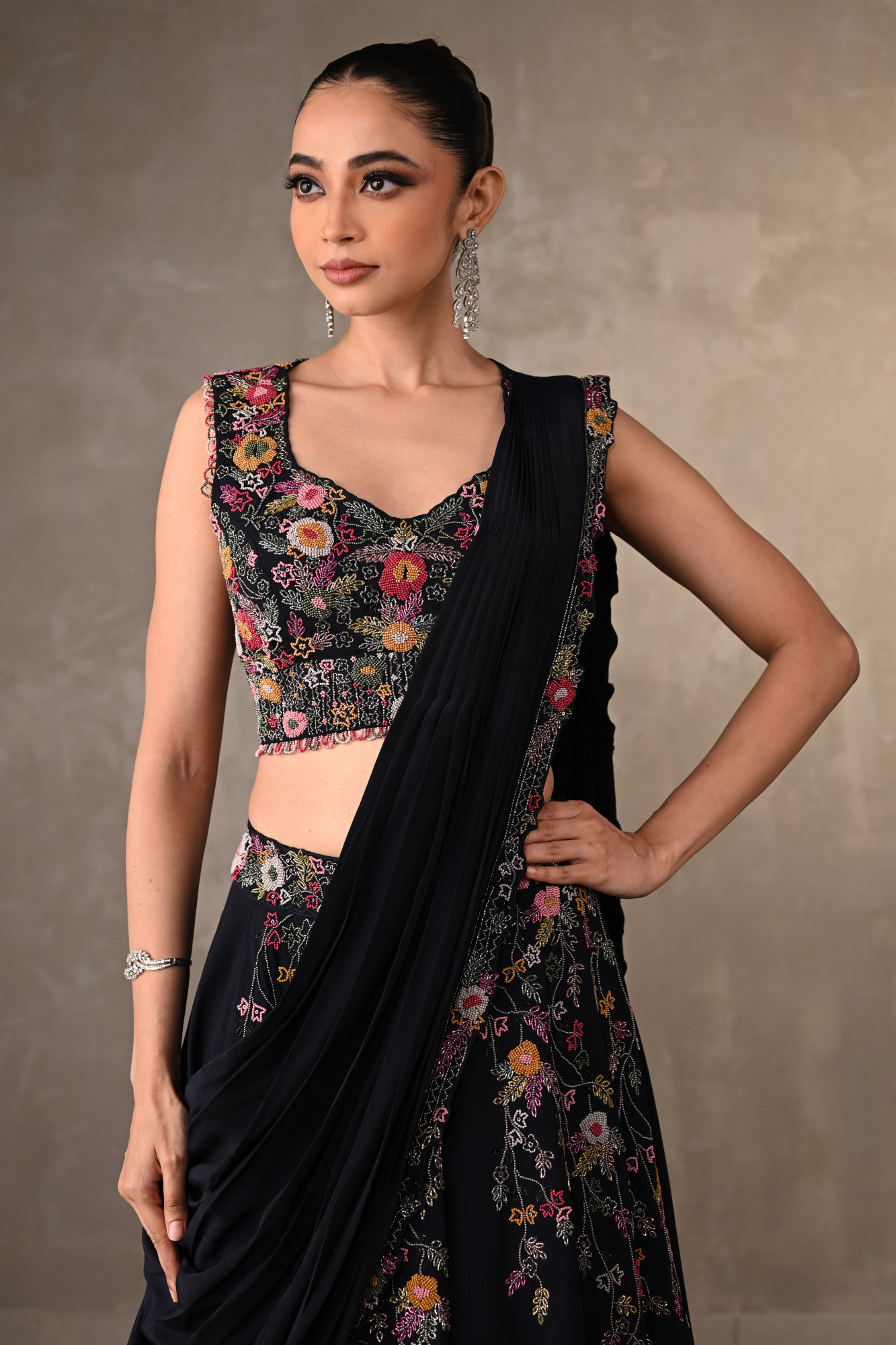 Crafted from a luxurious blend of georgette and crepe fabric, the sleeveless v-neck blouse is richly adorned with multicolour cheed, sequins, and cutdana work. the coordinating lehenga features cascading floral embroidery with intricate embellishments. the outfit comes with an attached drape dupatta, blending the charm of traditional draping with the ease of contemporary styling.