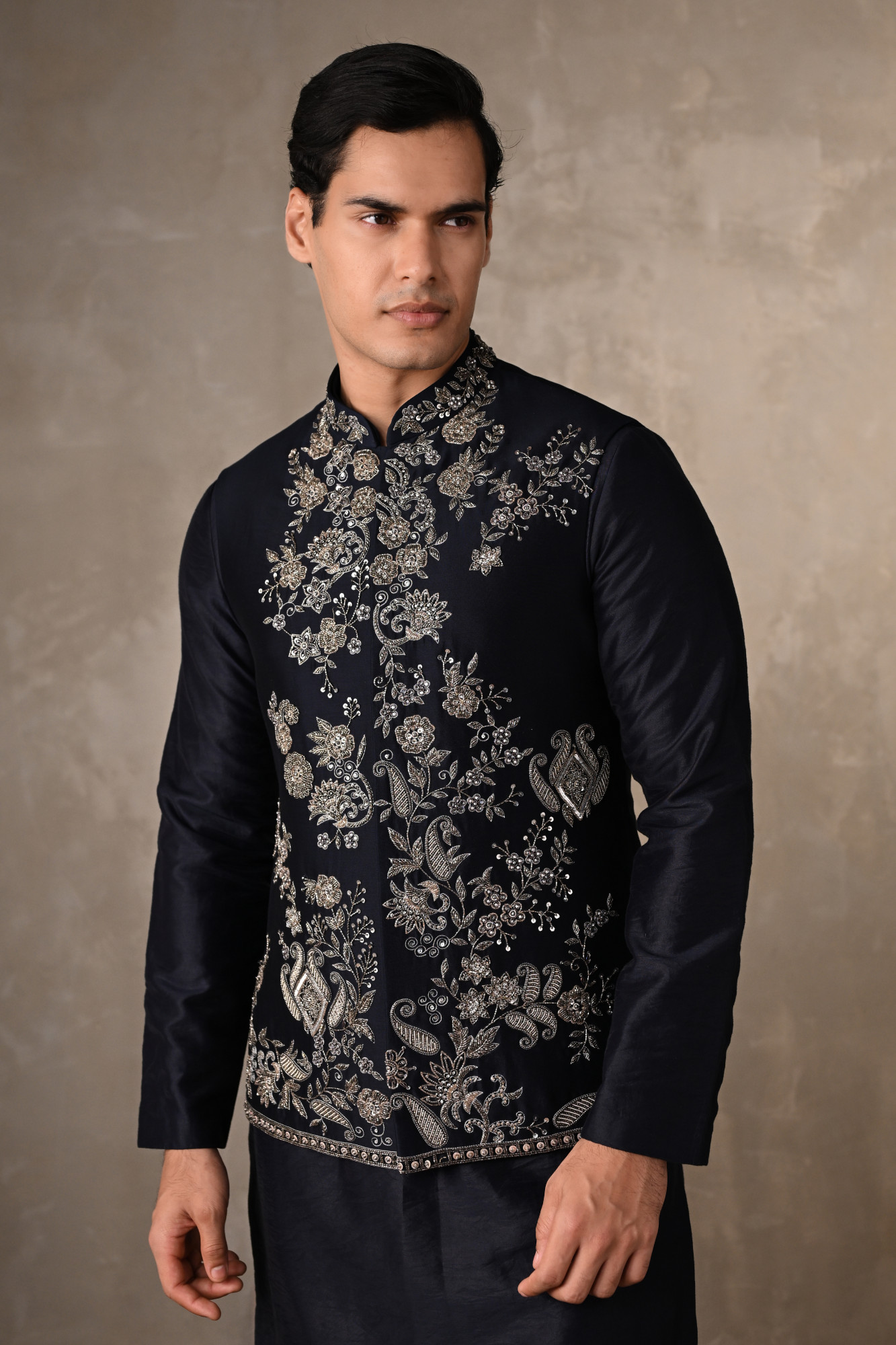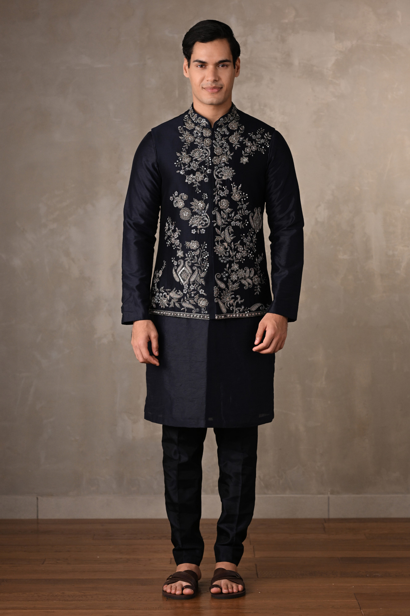 This navy blue chanderi bundi jacket and kurta set, made from rich chanderi fabric, the bundi jacket showcases exquisite silver floral embroidery that cascades across the front, adding a regal and sophisticated touch. Paired with a coordinated navy blue kurta, the subtle sheen of chanderi fabric combined with the ornate embroidery makes this outfit a showstopper.