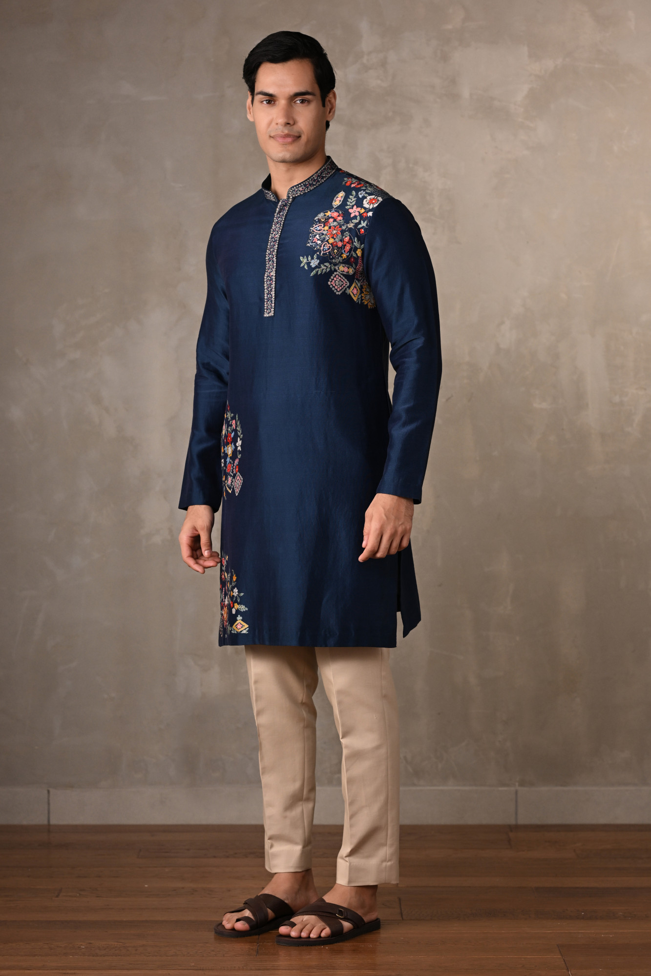 Crafted from luxurious chanderi fabric, it offers a subtle sheen and refined textures. the kurta is adorned with vibrant printed motifs enhanced with delicate embellishments, creating a rich interplay of colors and artistry. featuring a classic straight cut with a detailed placket neckline.