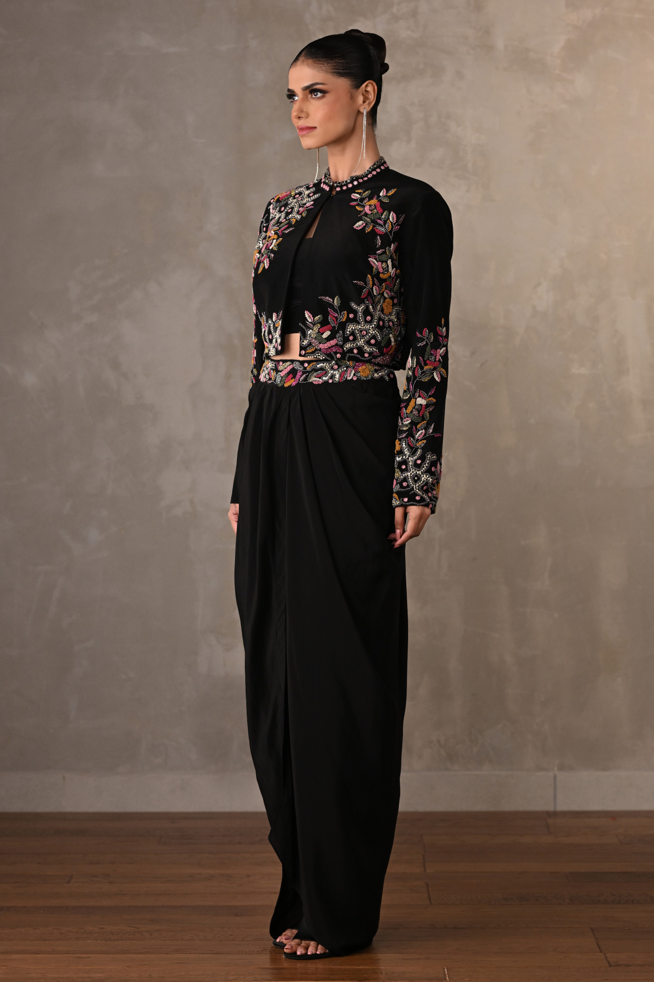 Noir Bloom Embellished Crepe Draped Skirt Set