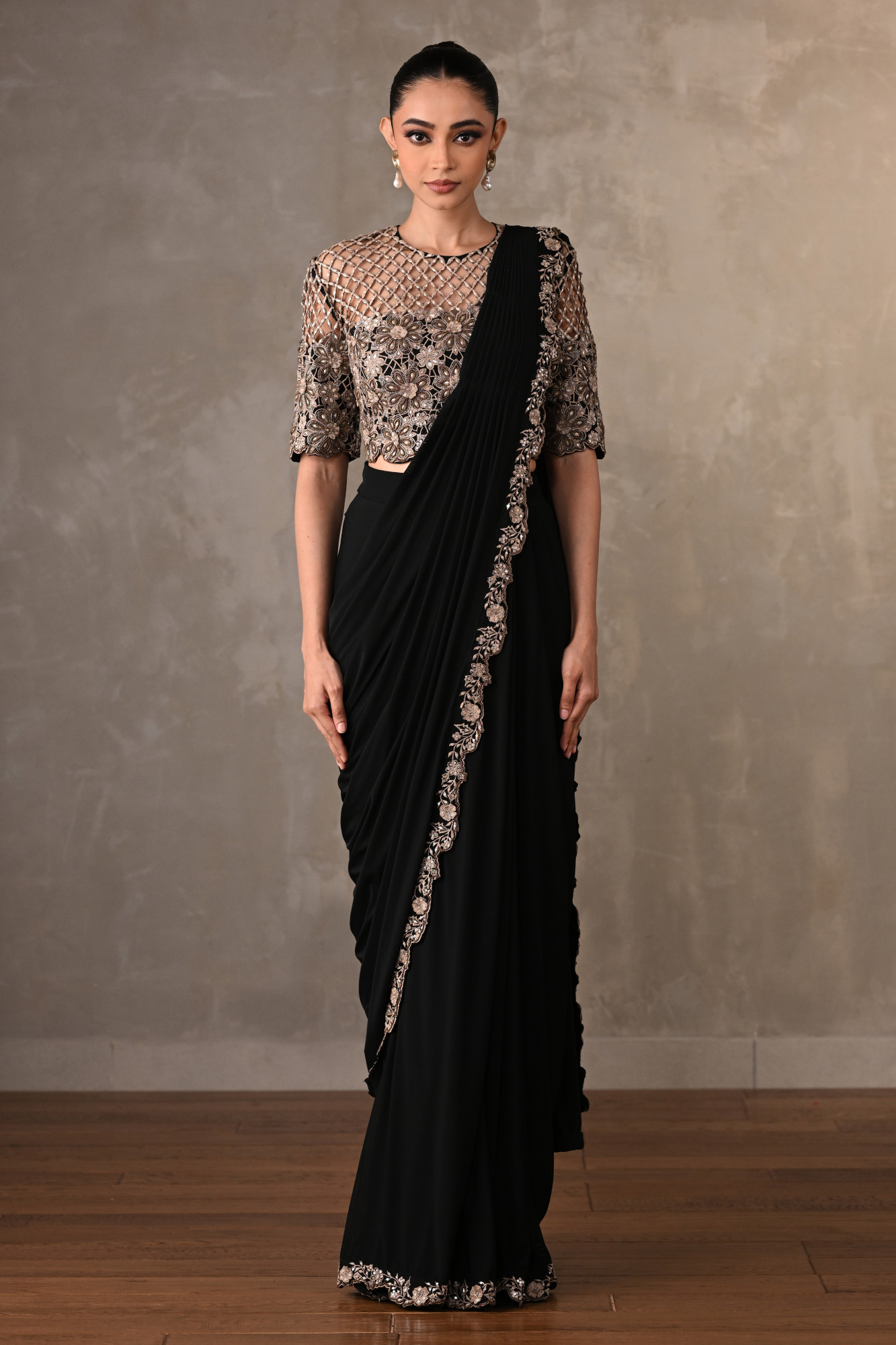 This black drape saree crafted in luxe lycra net fabric, featuring a beautifully hand-embroidered border with delicate floral motifs in metallic tones. paired with a stunning embroidered blouse showcasing intricate floral work.
