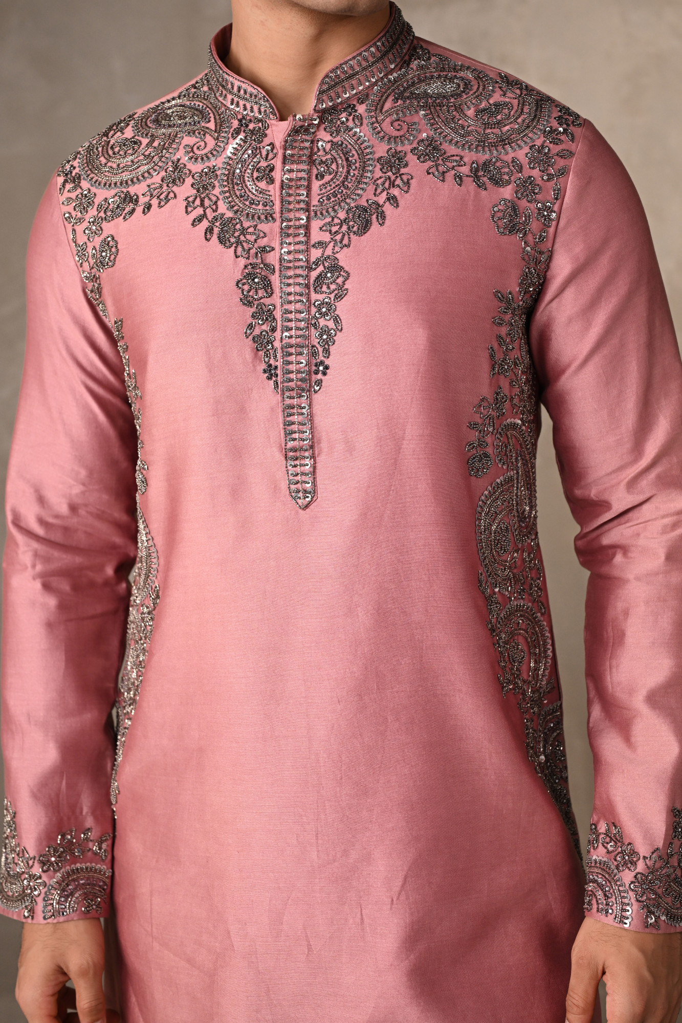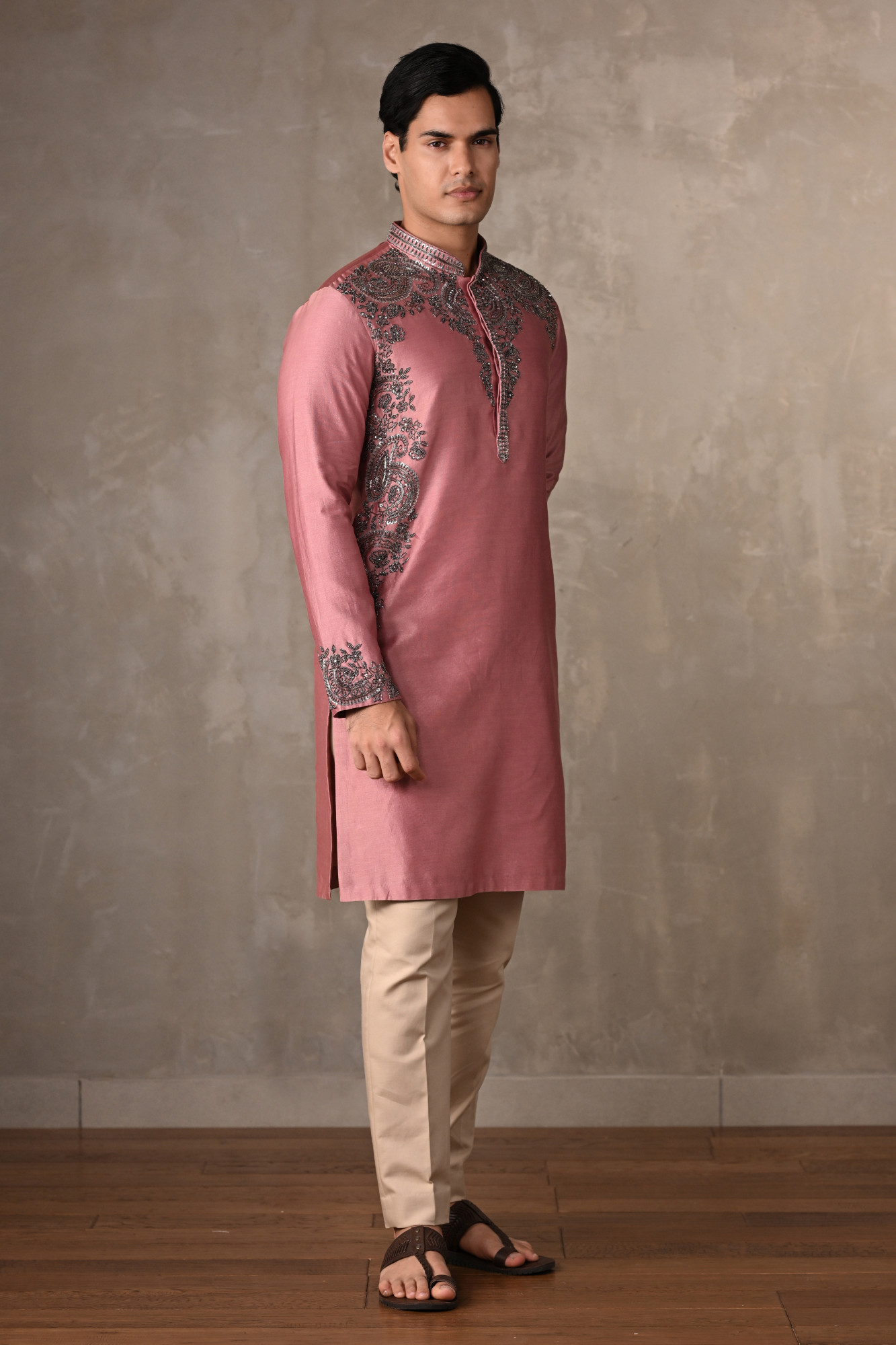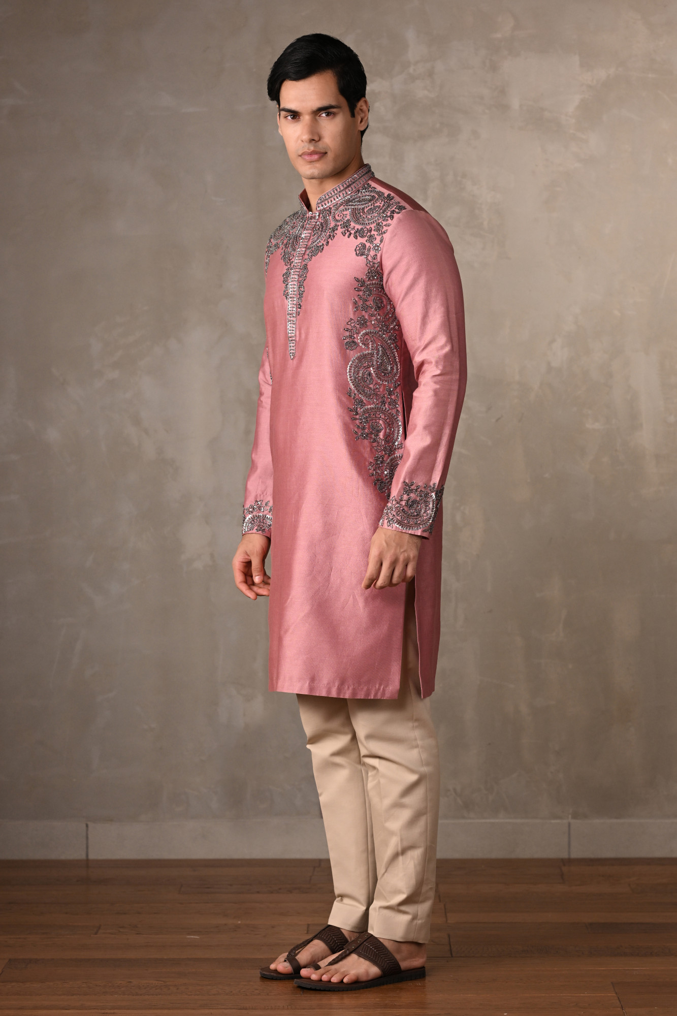 Crafted from luxurious chanderi fabric, the kurta boasts a subtle sheen. The neckline, shoulders, cuffs, and side panels are beautifully adorned with intricate thread and sequins embroidery.