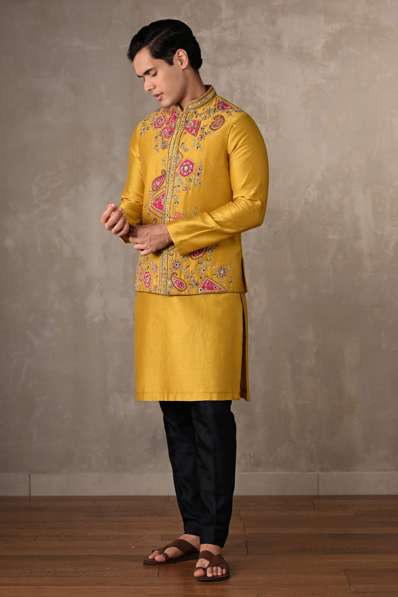 The bundi jacket paired with a plain kurta, crafted from luxurious chanderi fabric, the vibrant hue is enhanced by exquisite hand embroidery in contrasting tones, creating a rich interplay of traditional artistry and contemporary sophistication.