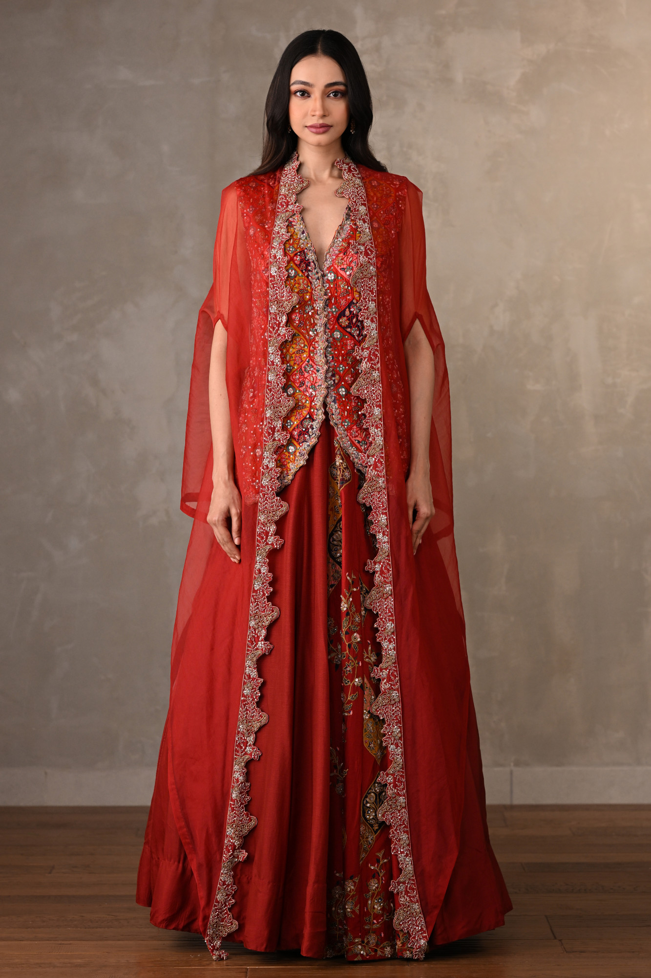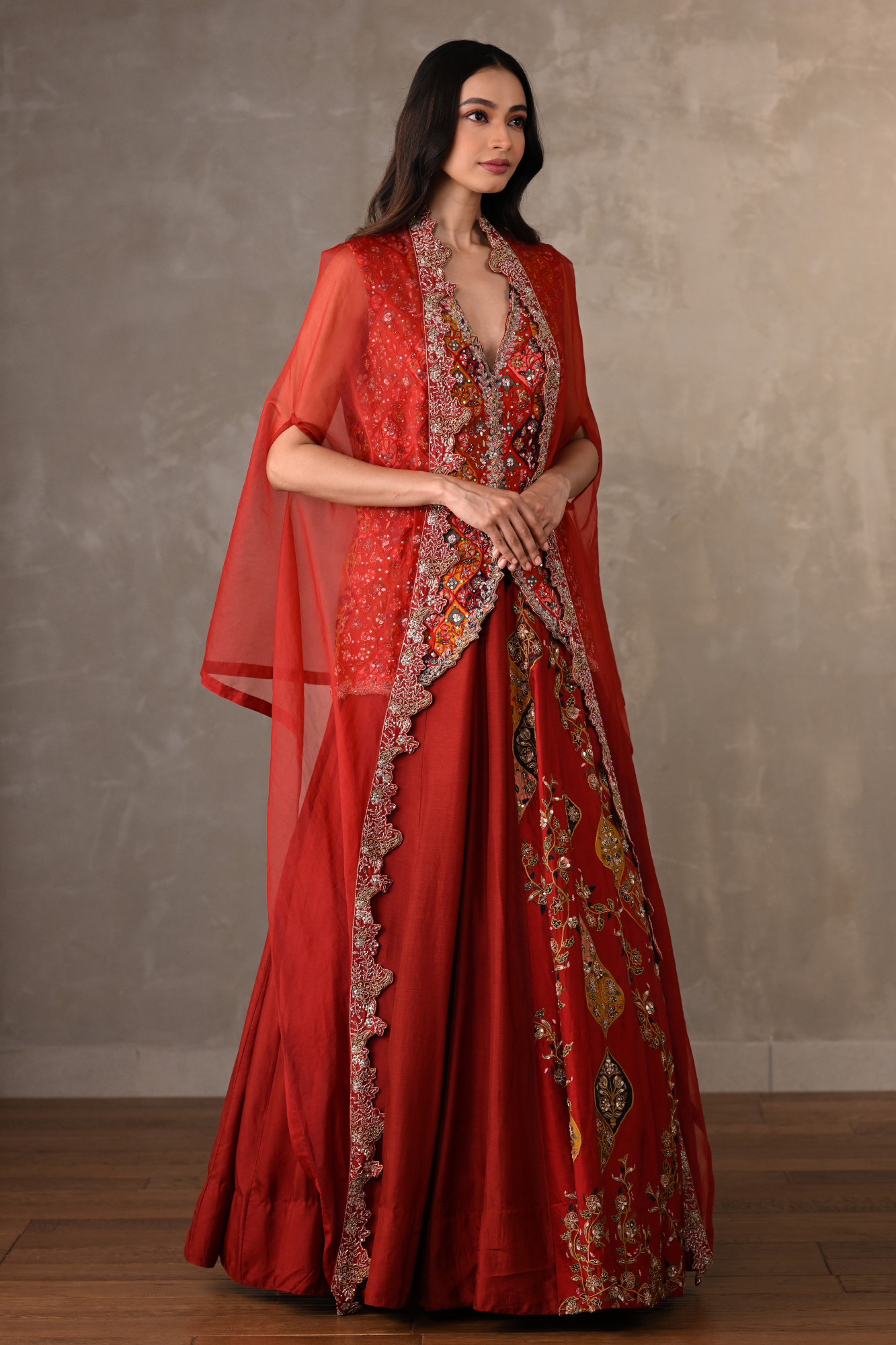 Crafted from rich silk fabric, this three-piece set includes a printed lehenga, a deep-neck embroidered blouse, and a graceful sheer cape. intricate zardosi work combined with delicate thread embroidery is placed over the striking print motifs, creating a stunning visual balance of color, texture, and heritage craftsmanship.