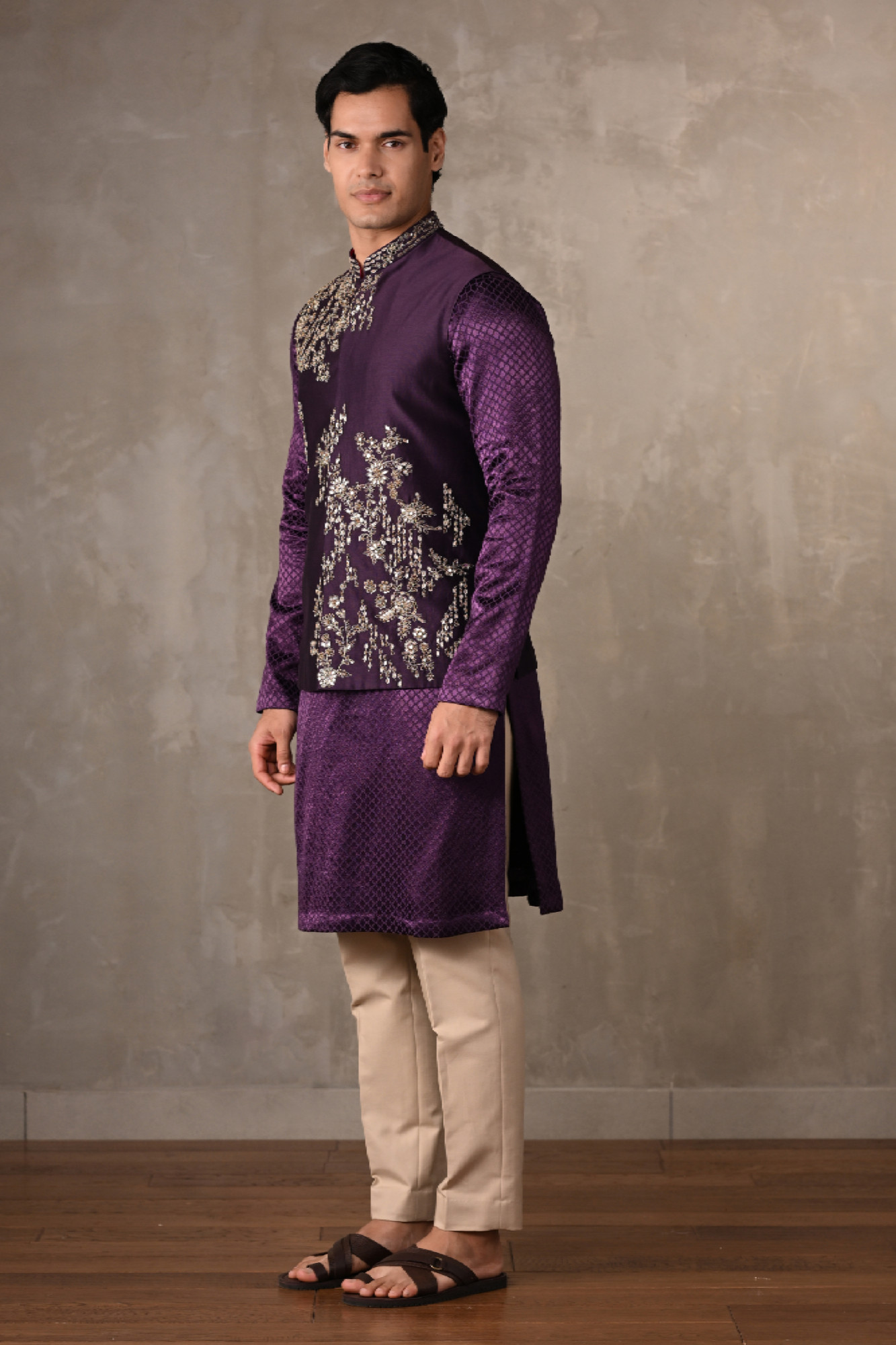 The deep purple bundi jacket is made from a luxurious blend of chanderi and silk, offering a rich texture with a natural sheen. intricate silver-toned thread embroidery elegantly cascades across the front and shoulder, adding a touch of opulence to the look. the jacket is paired seamlessly with a matching woven kurta that features a subtle diamond pattern on the lower panel, creating depth and contrast.