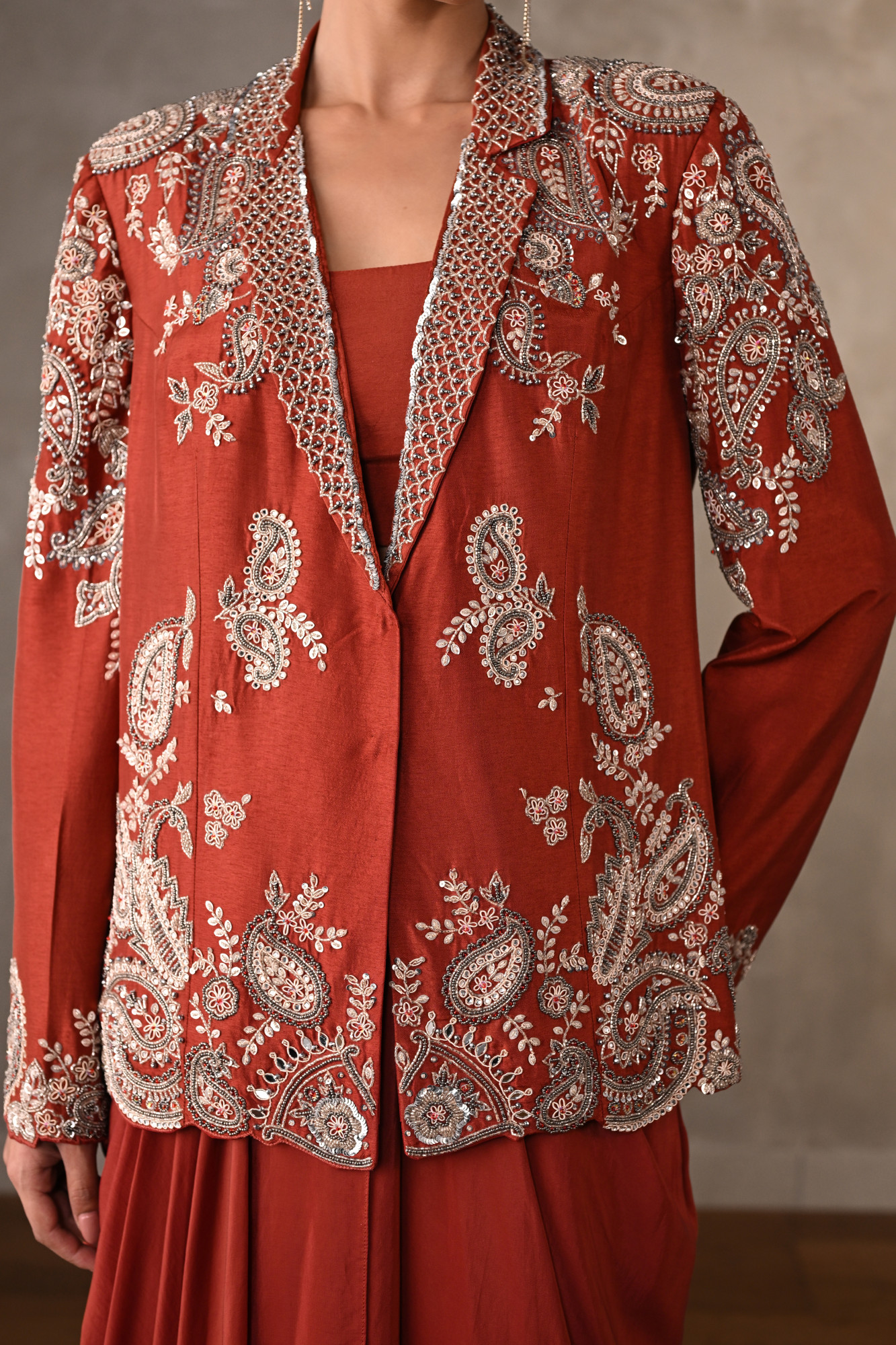 The three-piece ensemble is made from rich heavy crepe fabric and features a structured bustier that provides a clean, modern base and a statement jacket heavily embellished with a blend of sequins, cheed, mirror work, cutdana, dabka, and bead embroidery in intricate paisley and floral patterns; and a fluid drape skirt that adds