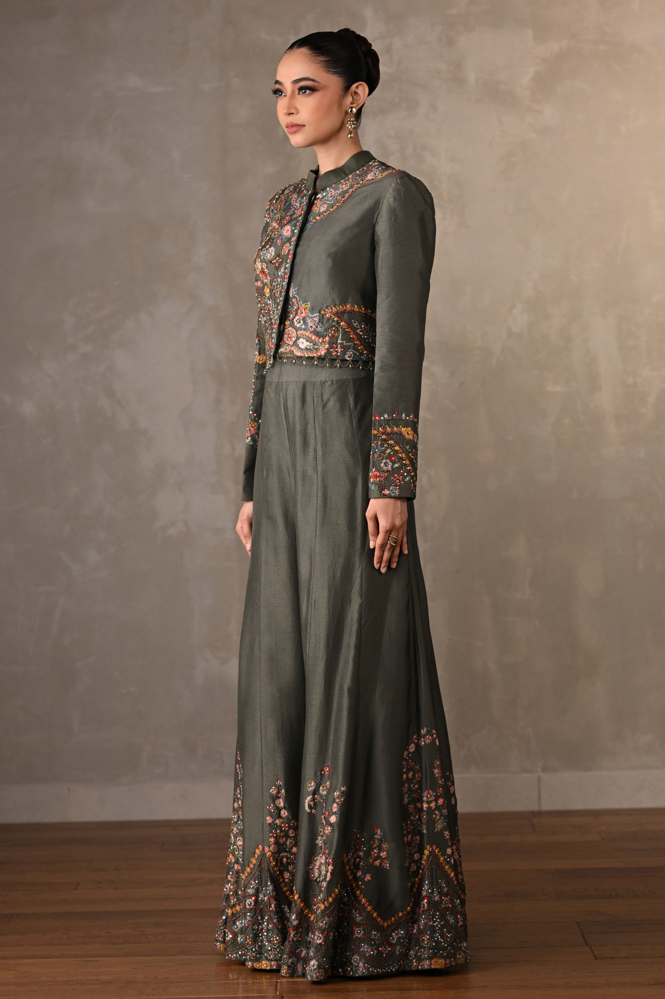Silk co-ord set featuring an embellished full sleeves cropped top suit paired with a full flared pants. Embellishments include beads, sequins, cheed, Cutdana and pearl work