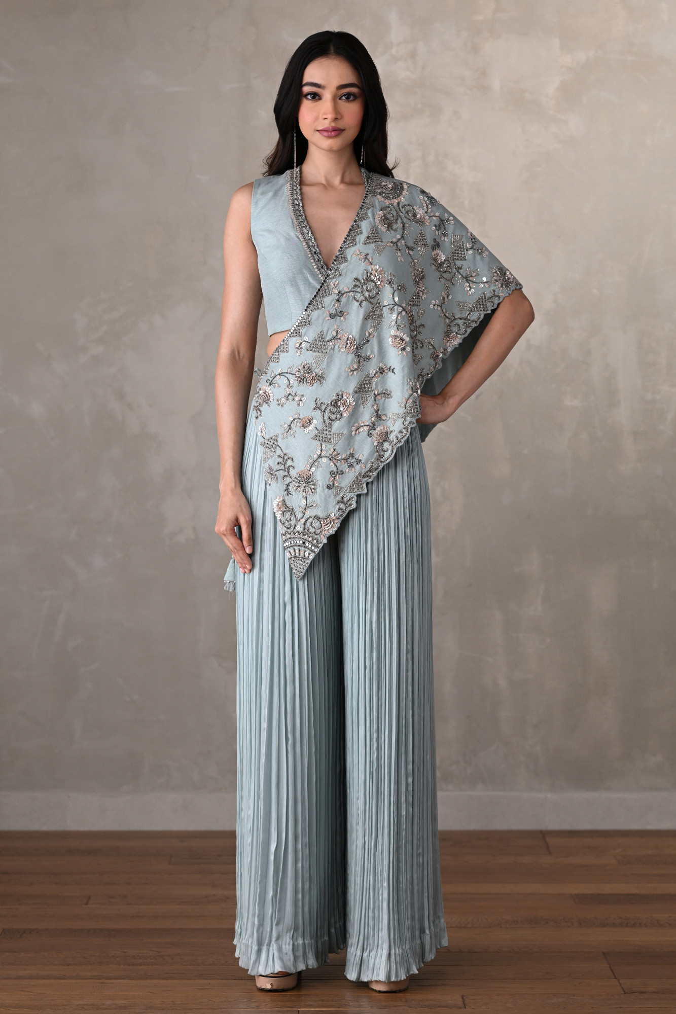 The ensemble features a sleeveless, deep V-neck blouse paired with finely pleated palazzo pants for a flowy silhouette. A beautifully embroidered one-shoulder drape, adorned with delicate floral and geometric motifs in silver and blush, adds a touch of tradition to this modern look. Perfect for daytime weddings, mehendi functions, or elegant evening events. Style with statement earrings and soft waves for a graceful finish.