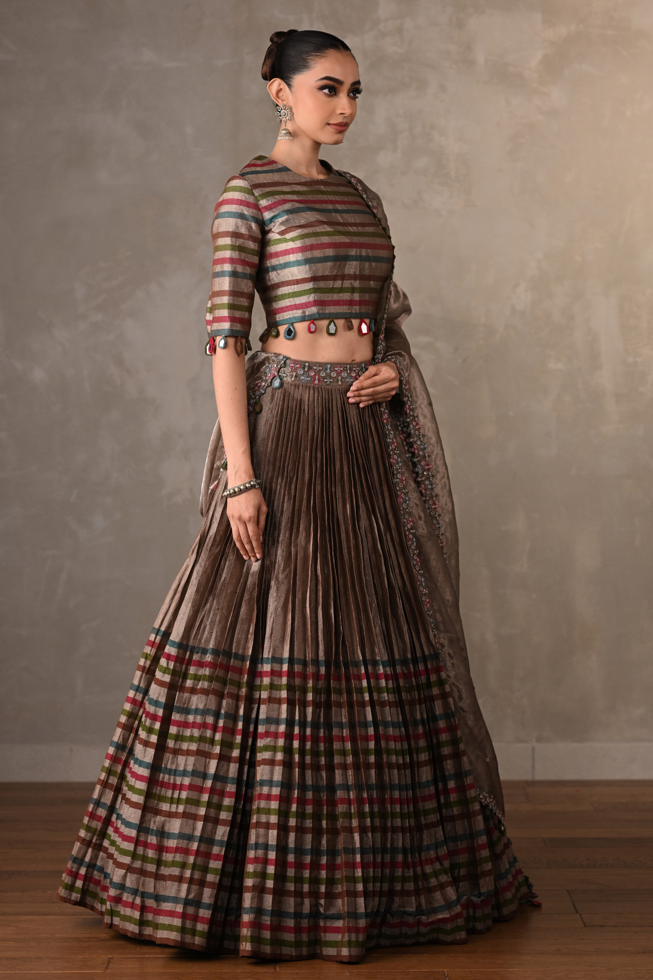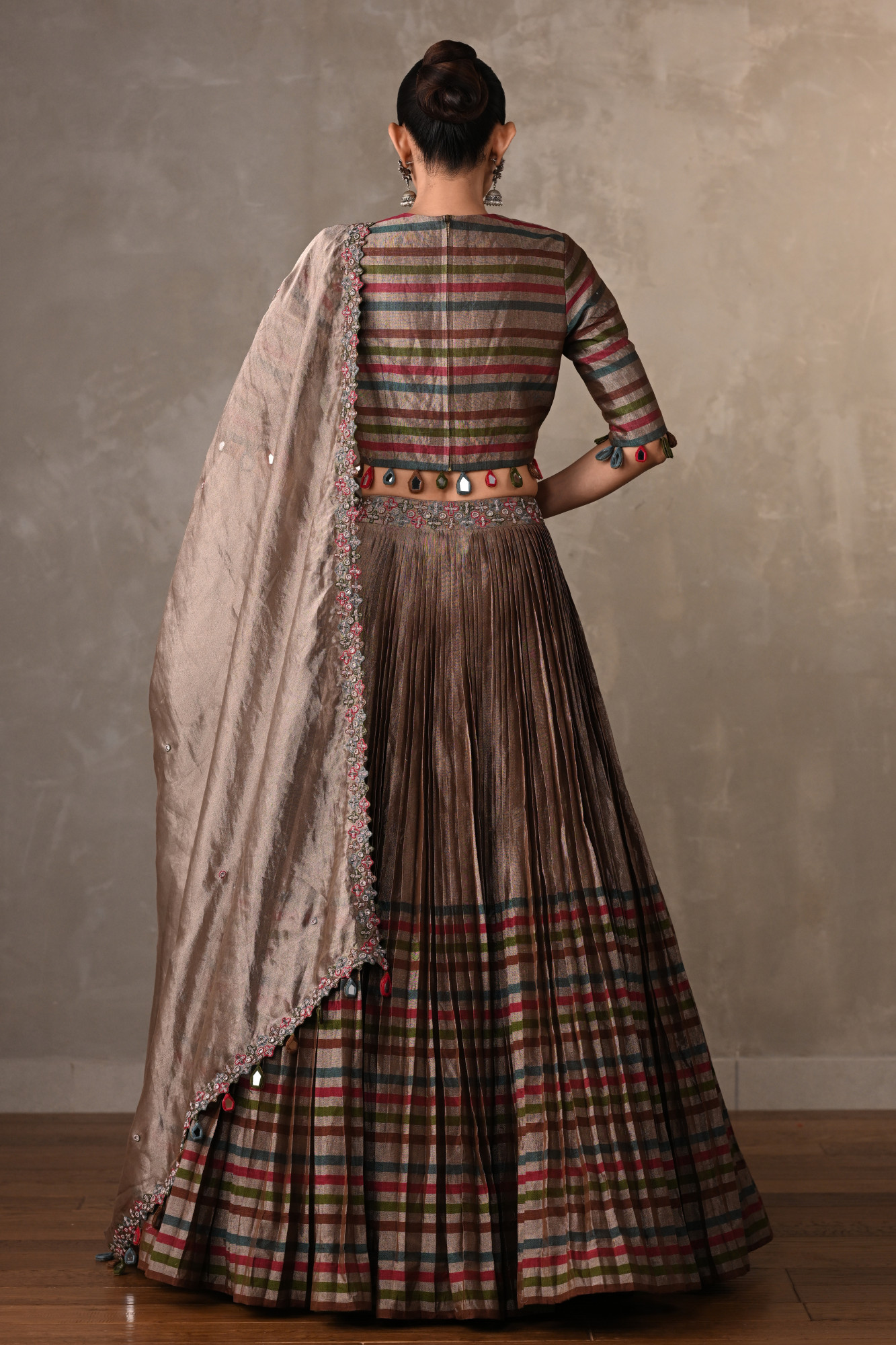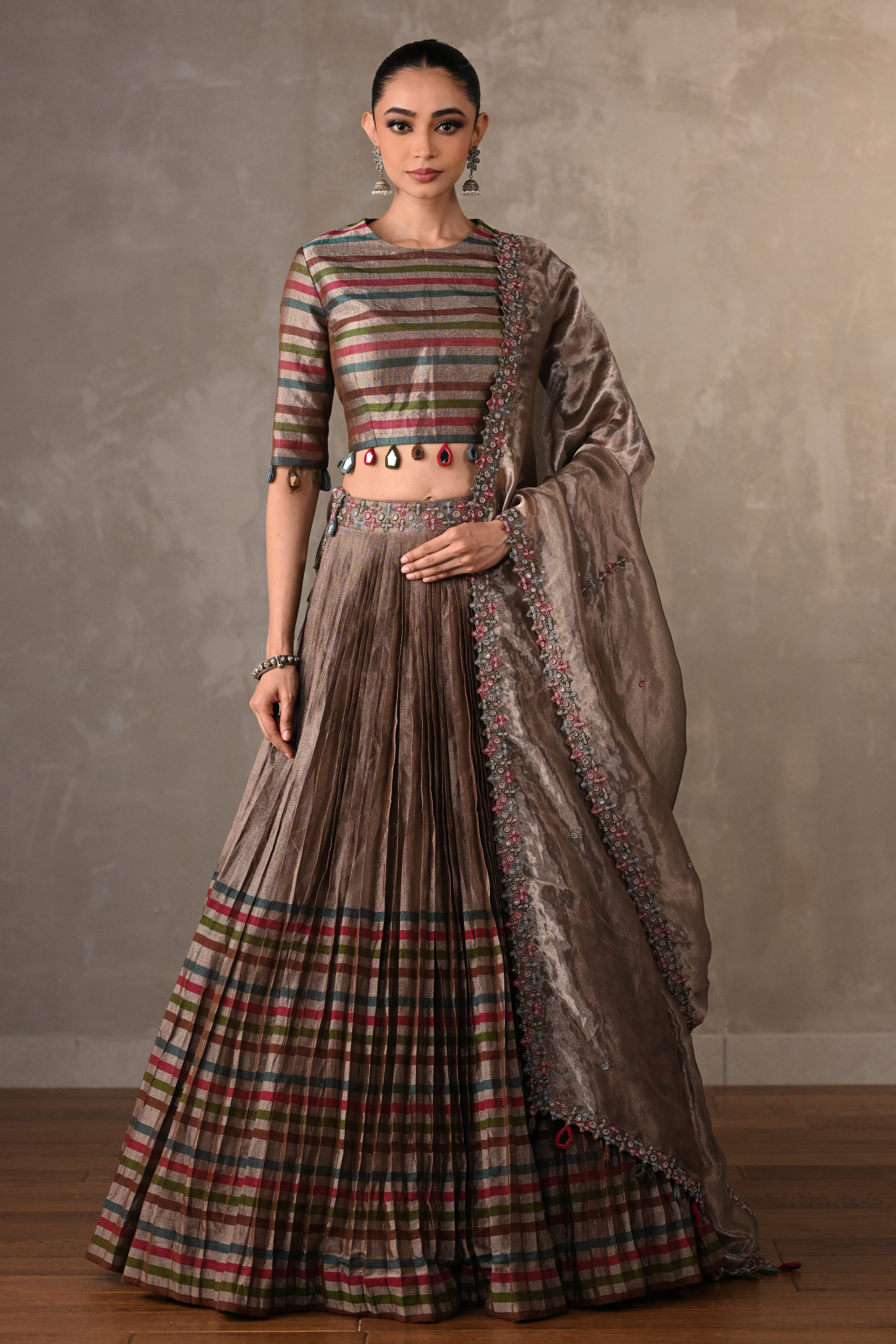 This elegant three-piece lehenga set is crafted from luxurious tissue fabric, featuring a striped blouse with tassel detailing, a pleated lehenga with matching stripes, and a richly embroidered dupatta.